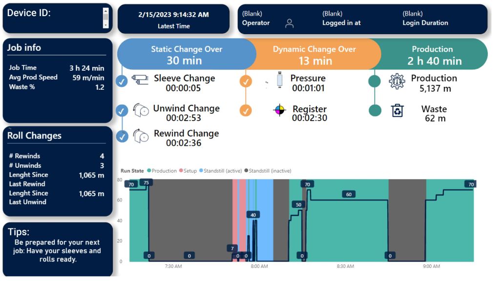 Its AI-driven intelligent algorithms uses the input from printing press functions and combines it with actual operator behavior. Using the combined data, which is updated every 5 seconds, the AI VirtualCoach analyzes and offers real-time solutions and warnings.